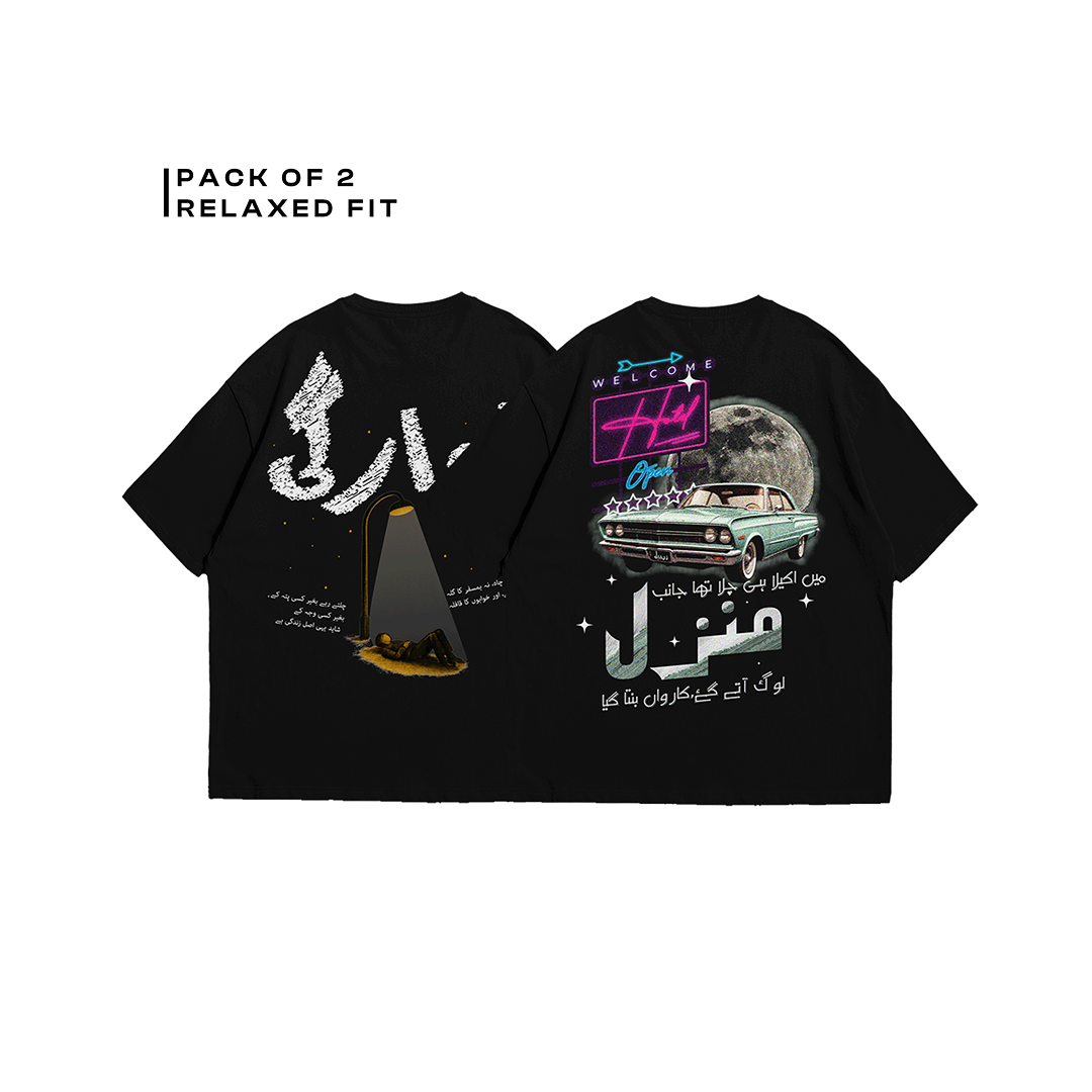 Freedom meets ambition. The Awaargi + Manzil T-shirt combo delivers premium comfort and bold style in a relaxed, street-ready silhouette.