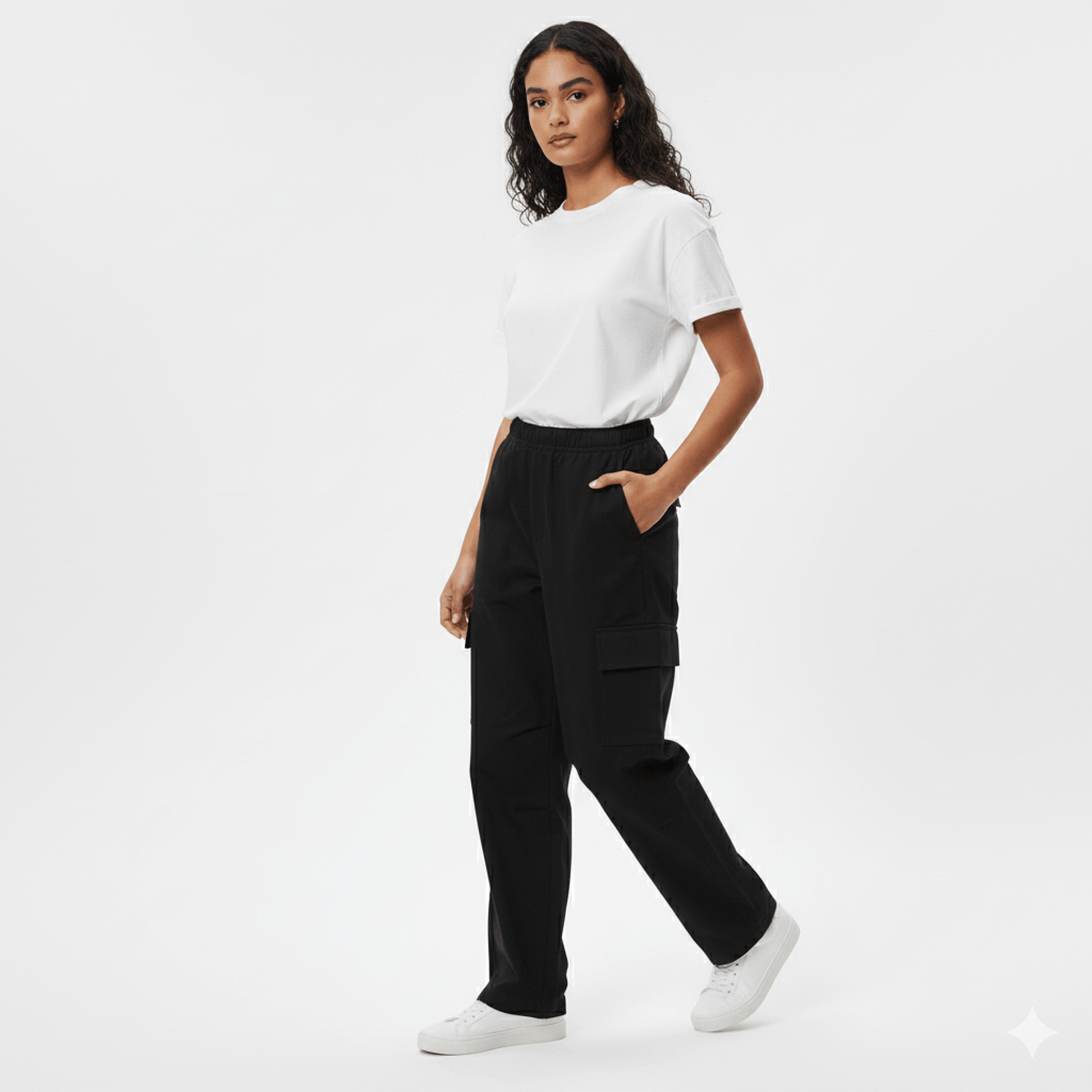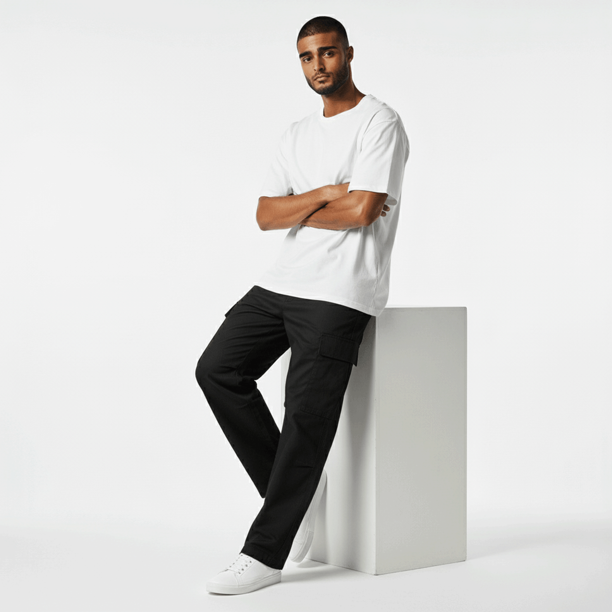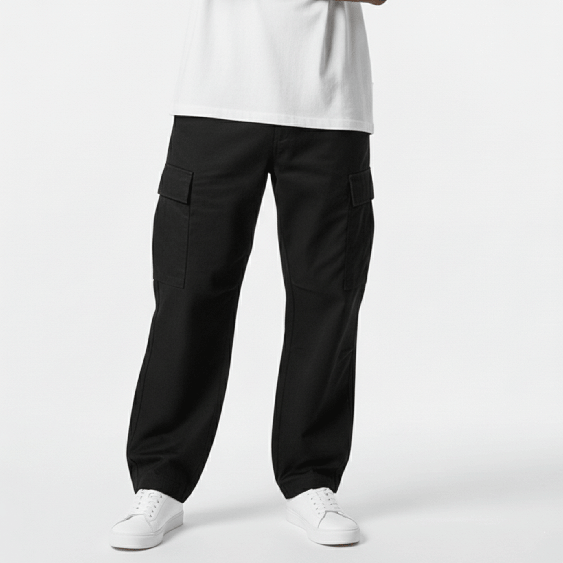 Upgrade your streetwear with our Black Loose Fit Cargo Pants, crafted from durable cotton twill fabric. Designed with a relaxed fit, adjustable waistband, and 6 utility pockets – including 4 flap pockets on the sides and back – these cargos balance comfort and functionality. The classic black finish makes them a versatile staple to pair with hoodies, tees, and sneakers.